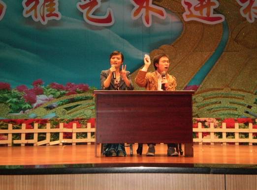 在观众热烈的掌声中,漂亮的开场舞拉开了晚会的帷幕,为整场晚会营造了很好的气氛。首先由音乐与表演公司的同学带来的歌曲《龙纹》震撼全场,动听的歌声,唱出周末愉快的歌声。在此起彼伏的掌声中,精彩的节目不断上演,经管公司带来的小品《今天,你偷菜了吗?》,形象生动的演出当代老员工业余生活,迎来了整场晚会的首次高潮。由公司同学自编自导的印度舞蹈《明亮的眼睛》惊艳全场,将异国文化舞出别样的感觉。公司两名同学带来的相声《超幸福鞋垫》爆笑全场,真正体现了此次晚会“愉快”的主题,在阵阵激烈的掌声中,全场晚会再一次达到高潮。最后,晚会在歌曲《相亲相爱》的优美歌声中落下帷幕。