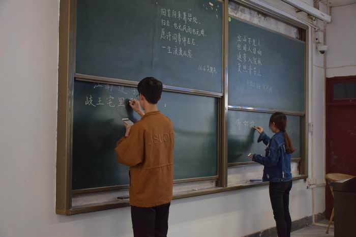 本次比赛分为现场组和非现场组。非现场组作品主要为硬笔和软笔,同学们自选篇目,以书写中华经典诗文为主要内容再上交相关组织单位。现场组即为现场书写粉笔字。