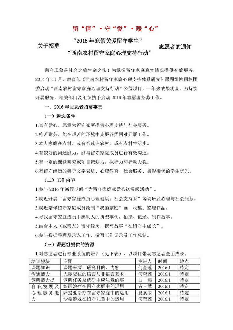 关于招募“2015年寒假关爱留守员工”“西南农村留守家庭心理支持行动”志愿者的通知