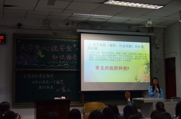 活动开始时,各班的宣传委员为大家讲述了各种安全知识,主要包括五个方面的内容。第一,如何保持心理健康和进行心理调节。第二,女生在独行时应如何保护自己,老员工在独行时可能遇到的问题以及解决办法。第三,如何做到集体宿舍的安全防范工作。第四,关于“求职”的各种陷阱以及遇到陷阱应如破解。第五,围绕“老员工如何化解恋爱纠纷”做了相关讲述。此次活动采用有奖问答的方式,同学们都争先恐后的参与活动,现场气氛温馨而活跃。