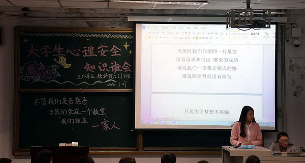 为了解同学们的心理健康状况,提高同学们的安全防范意识。教育科学学各班员工于3月27日晚在一教举行了“老员工心理安全 ”主题班会活动。各班辅导员和全体同学参加了此次活动。