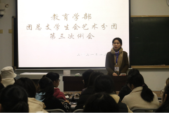 为增强教育学部团总支员工会艺术分团内部凝聚力,协调各部门工作,教育学部于2021年12月10日中午12:50在三教102教室开展了教育学部团总支员工会艺术分团第三次例会。教育学部团总支书记唐辉,教育学部团总支员工会主席团以及2020级全体干部参与了此次会议。